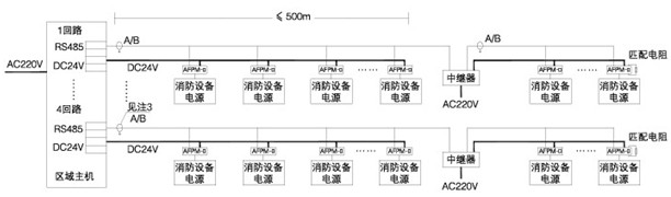 2)传输距离大于500m时,需加中继器,1合中继器占用1个传感器(监控模块)地址,中继器的AC220V电源线采用3*1.5mm^2,由现场消防电源或消防监控室监控器(主机)提供。